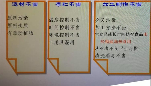 生活中食品中毒發生的原因通常是選材不當,存貯不當,加工制作不當,我們要杜絕發生!