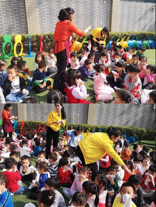 從教室撤離出來,老師在清點本班級幼兒人數是否全部撤離到安全地點。