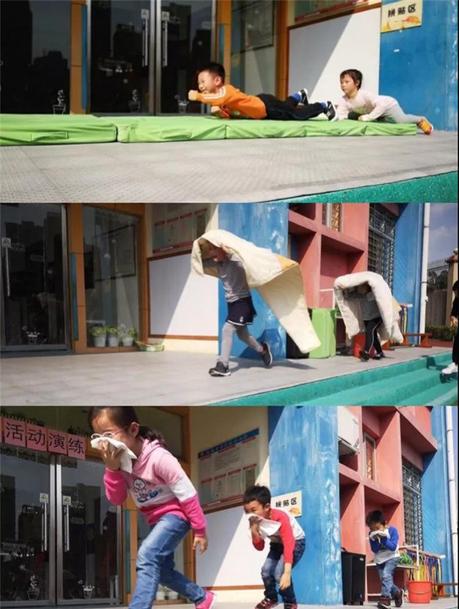 孩子們把老師所教的消防知識都實用上了,逃生時都會在第一時間立刻拿上打濕的毛巾,捂住口鼻彎腰離開火災現場。