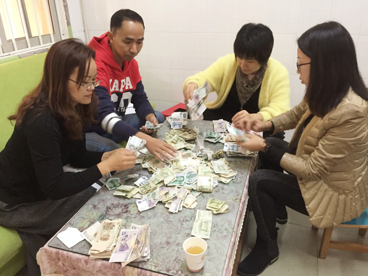 家長代表、黃主任和財務(wù)一起清點捐款數(shù)額及轉(zhuǎn)帳