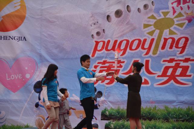 運動會的圣火已經點燃,從園長媽媽手中接遞的是櫻桃B班代表蔡鎧霖一家