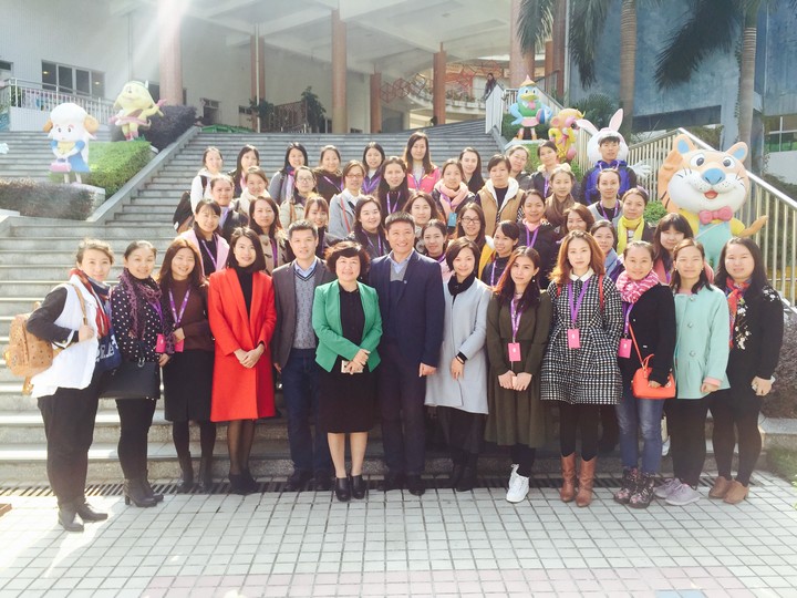 時間: 2016-12-31 作者:yuanhengjia 閱讀次數: 359512月30日上午,踏著清晨的露滴,迎著清涼的北風,和暖的冬日陽光一路照射著這群追逐幼教事業的深圳市學前教育“苗圃工程”骨干教師研修班的全體學員來到東莞!公明二幼教學園長譚偉橙、教學主任陳麗芬也參加了此次培訓班,在深圳大學副院長唐國良教授及楊建老師的帶領下,首先來到了東莞市虎門東方明珠幼兒園實踐觀摩,幼兒園占地面積一萬多平米,環境優美、空間寬敞、芳草茵茵、悅目怡人,以“美化、綠化,教育化、兒童化”為目標,老師們的親切熱情,孩子們天真活潑,讓我們充分感受到園所的文化與特色;戶外體育大循環,把幼兒園的戶外場地運用得淋淋盡致,老師與孩子們在綠草茵茵的草地上走、跑、跳、爬、鉆的體能訓練,讓孩子們真正盡情的擁抱自然,充分感受戶外活動的樂趣,練就強健的體格,老師、孩子們統一的粉色園服融為一體,在運動場地上是一道青春亮麗的風景。