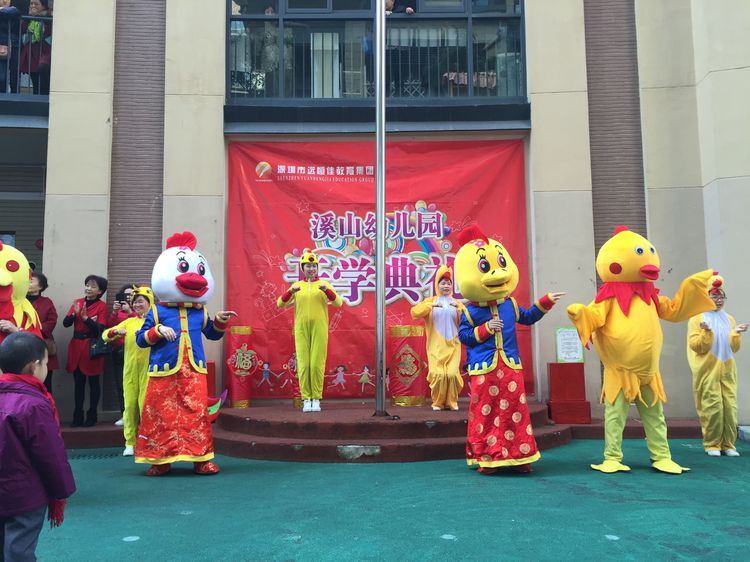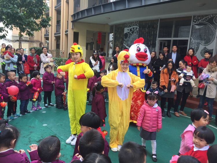 老師和爸爸們裝扮成喜氣洋洋的吉祥雞在門口迎接小朋友們的到來!看那一張張洋溢著幸福的笑臉~咱們新的一學期就此開幕!