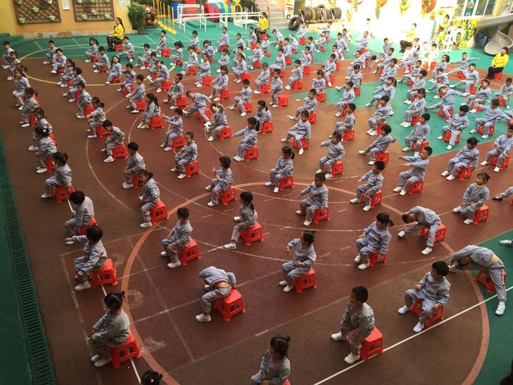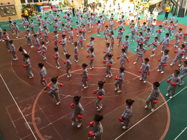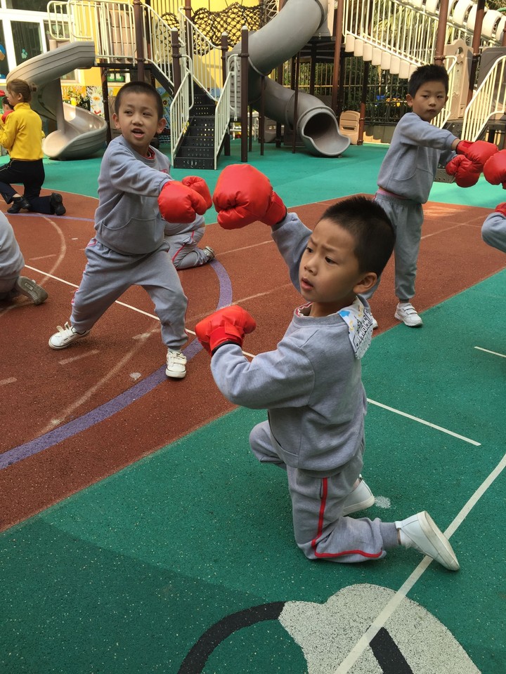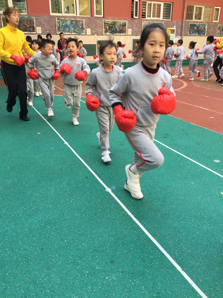 看!伴隨著歡快的音樂節奏,大班的小朋友們在老師的帶領下表演起了“拳擊操”,孩子們十分投入、整齊劃一地做著每一個動作;各班的教師也精神抖擻地分別站在隊前和隊后與孩子們一起做操,整個操場上洋溢著歡樂的氛圍!