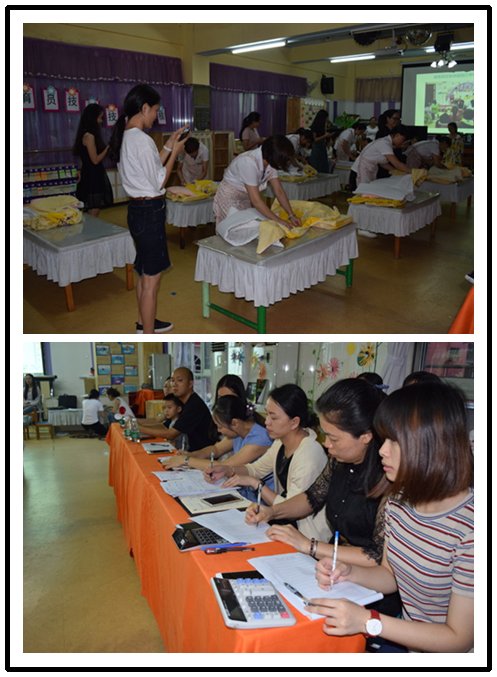 時間: 2017-05-26 作者:yuanhengjia 閱讀次數: 2363為促進我園保育老師基本專業技能的發展,促進保教結合,建設一支高素質高質量的保育員隊伍,不斷提高我園保育工作、管理水平和保育質量;我園在5月份對全園保育老師進行技能技巧考核,考核分筆試和實操。實操考核內容為“1.疊被子2.擦桌子”。本次考核疊被子,擦桌子這些內務,主要目的是要規范保育員日常操作流程以及提高保育員工作的效率,讓保育員的內務工作能力更上一層樓。