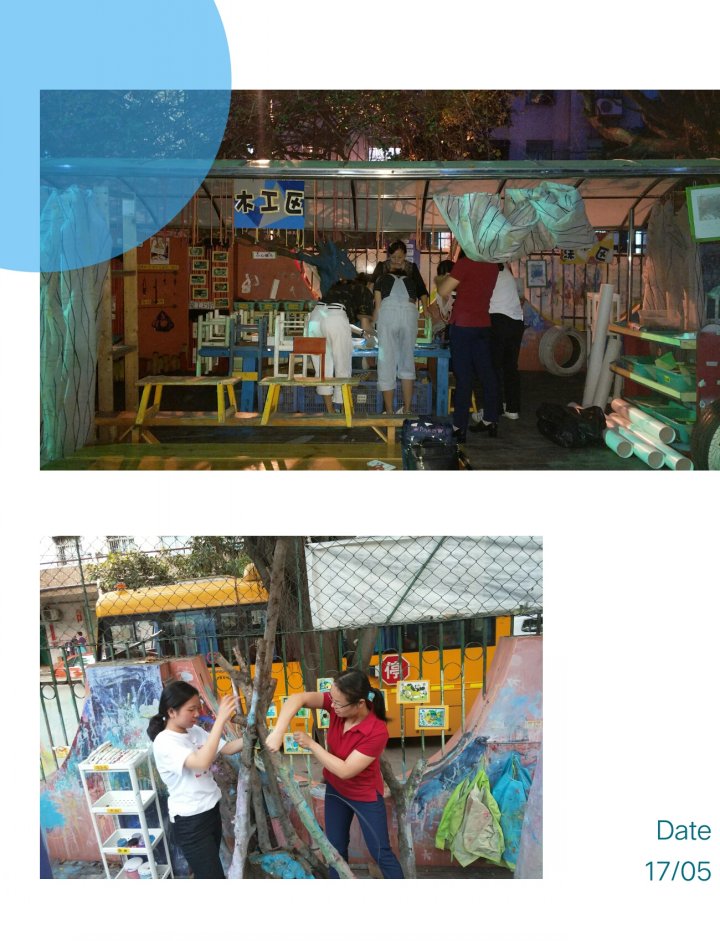 大班級組:承擔了木工區、玩水區、表演區的環境創設與材料的投放。木工區根據中大班幼兒的發展及年齡特點,提供錘子、釘子、鉗子等工具讓幼兒進行一些拆、裝、拼等活動,鍛煉幼兒的手部肌肉和精細動作的發展,并提供一些木工膠水、螺絲釘、護目鏡、手套和與木工相關的書籍。