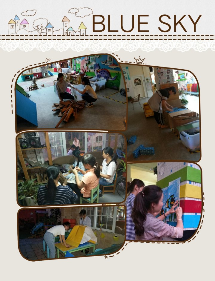 所以根據不同年齡段的幼兒提供不同層次需要的游戲材料,或同一游戲材料有適合不同年齡層次幼兒玩的指引,我們教師以級組為單位開展了教研,圍繞室內外一體化的主題并考慮到戶外游戲的特點(空間大、材料相對簡單、粗糙、自由度大)以及戶外投放材料的特點(防曬、防雨、便于取放),給幼兒創設更適宜的活動環境與材料: