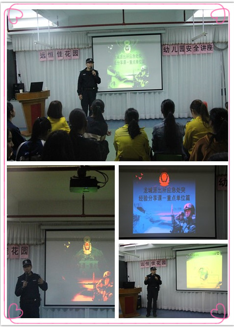 為進一步強化安全管理,打造平安校園,確保師幼安全,提高教職工的反恐防暴意識,掌握和提高“反恐防暴”知識和技能,12月15日下午,花園幼兒園邀請龍城派出所的劉峰教官在二樓音體室為全體教職工進行了一次反恐防暴的安全知識講座。