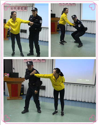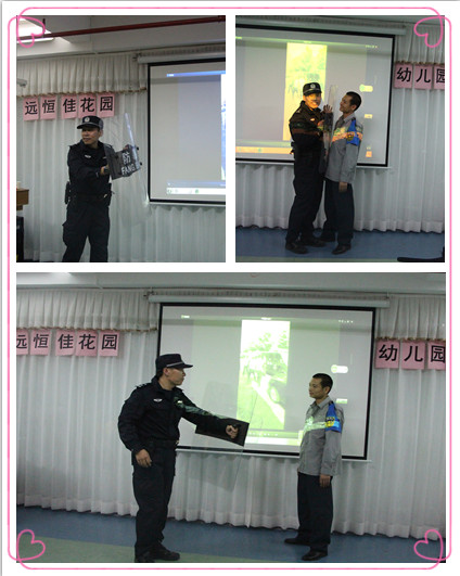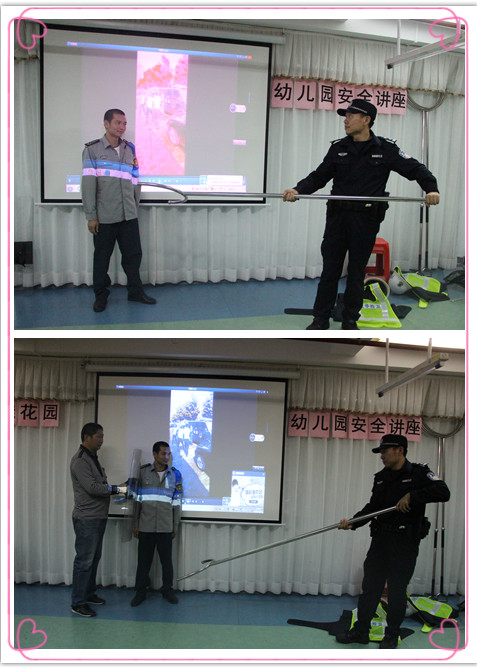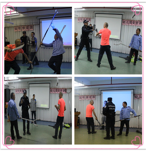 首先,劉教官對于我們身邊的沃爾瑪恐怖事件、羅湖砍殺事件、寶安區519等暴力事件進行了視頻播放和詳細分析,不僅讓全體教職員工深切體會到了暴力事件的可怕性,而且提高提高了教職工的反恐防暴意識。然后,劉教官分別對于保安和教師的反恐防暴技巧進行了演示指導。例如,讓一名保安扮演暴力嫌疑人,對鋼叉和防暴盾牌的使用方法進行了指導和演示;老師扮演受害者,演示如何進行自我保護。最后,針對幼兒園的實際情況對反恐防暴提出了以下幾點注意事項:一、一旦有危險人物或暴徒闖入,教師不要慌,一定要保持冷靜;二、關緊門窗,盡量把孩子與危險人物隔離開,將幼兒隱蔽起,避免近距離接觸,引起傷害;三、一定要想辦法拖延時間,等待救援,盡量避免身體正面接觸,引起不必要的傷亡;四、一旦發生意外事件,馬上報警,將傷害降到最低程度。