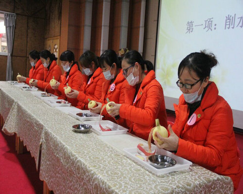 時間: 2017-12-29 作者:yuanhengjia 閱讀次數: 26452017年12月27日上午9:30分,長壽區遠恒佳實驗幼兒園、遠恒佳陽光園、遠恒佳菩提印象園全體保育老師在遠恒佳教育集團學前教育中心長壽分部的組織下進行了削水果、疊被子兩項技能競賽。