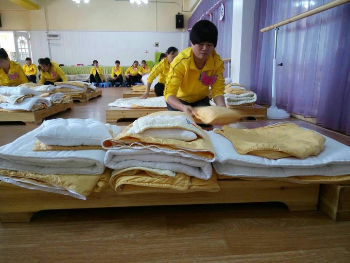 到了最激動人心的時刻,第三項的保育老師的操作技能考核:2018年1月4日,今年我們的活動主題是疊被子,扎頭發比賽。疊被子、扎頭發是我們保育老師每天都在做的事情,被子疊得好不好?給寶寶扎頭發美不美?這次活動將給我們保育老師最好的展示自我的機會。我們邀請了各班級的代表家委與學校領導來做評委,比賽按照年級分組,分三組進行疊被子、扎頭發的比賽。疊被子我們要求:套被子平整無皺褶,棱角分明,大小一致,整齊美觀,LOGO在同一個方向。比賽開始了,我們的保育老師疊被子的手法很嫻熟,每位老師都能在5分鐘內疊完三套被子,真的是很厲害的,而且也達到了要求說的棱角分明、大小一致、整齊美觀、LOGO在同一個方向。
