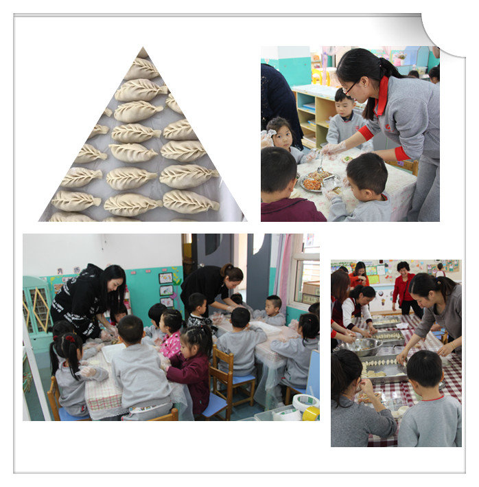 孩子們在老師和家長的帶領(lǐng)下包餃子。