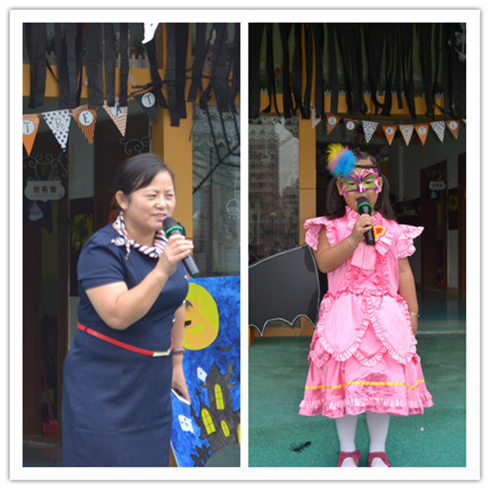 活動的第一個環節,“淘氣鬼”賣萌,小朋友們都穿著奇裝異服,跟著音樂的節奏萌萌的走了一場別具一格的秀。全園的孩子站在一起時場面是非常壯觀的呀!既然是西方的節日,那就少不了語言是滲透啦,英語老師邀請了萬圣節的幾個突出的角色裝扮的小朋友,讓孩子們一起認識這些角色的英語怎么說,孩子們學得可認真啦!最搞笑的要數老師的游戲“瘋狂木乃伊”啦,看著每個級組的老師代表在臺上合作將另一個老師包成“木乃伊”孩子們都很激動,紛紛給自己的老師加油,讓整個活動達到了高潮。