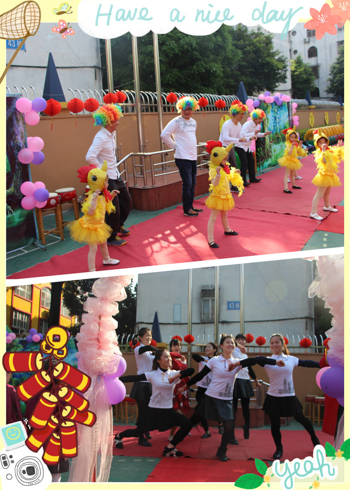 爸爸隊和舞蹈班孩子們的舞蹈《金雞報曉》和老師們的歌曲《擼起袖子加油干》
