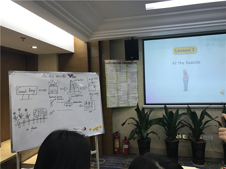 第二天上午的主題是自然拼音教學(xué),是由講師為我們講解自然拼讀教學(xué)的意義、目標、核心原則與方法,同時還展示了課堂實操,讓我們更直觀地理解了自然拼讀法的意義和具體操作方式。在學(xué)習了上午的理論知識后,下午我們所有學(xué)員分組進行故事教學(xué)設(shè)計與展示,我們被分到了第五組,我們與同組的老師們在很短的時間內(nèi)完成了At the Seaside教學(xué)設(shè)計和講故事的設(shè)計,其中我們的亮點是簡筆畫教學(xué)和分層教學(xué),給現(xiàn)場的老師們留下了深刻的印象。