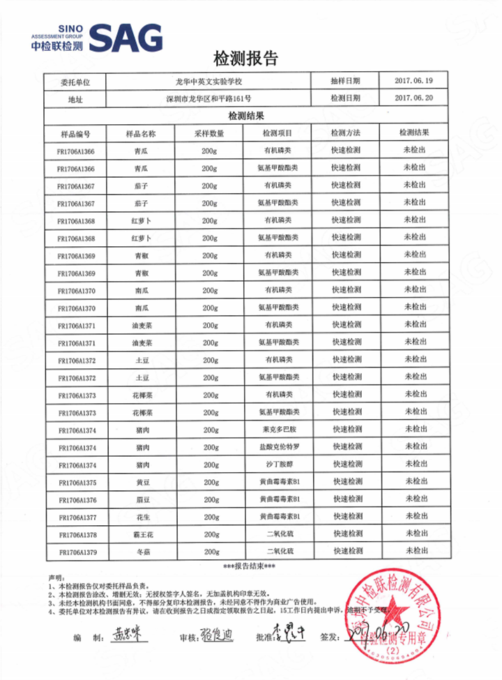 時間: 2017-06-22 作者:蔣明輝 閱讀次數: 35112017年06月19日,深圳市龍華區教育局委托第三方專業機構對我校食品食材進行抽樣檢測。深圳中檢聯檢測有限公司隨機抽查我校14種食材,對這14項食品進行了24項專業檢測,所有被檢測食材全部達標,達標率100%。