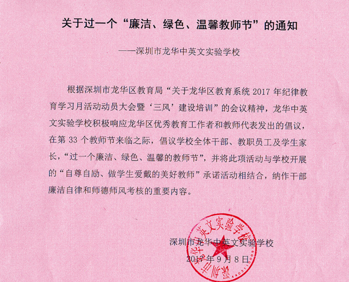 在活動現場,龍華中英文實驗學校曾慧主任代表學校及全體教職工,發出了《過“廉潔、綠色、溫馨教師節”》的倡議,倡議學校全體干部、教職員工及學生家長,“過一個廉潔、綠色、溫馨的教師節”,并將此項活動與學校開展的“自尊自勵、做學生愛戴的美好教師”承諾活動相結合,做一個廉潔自律、受學生愛戴的美好教師。