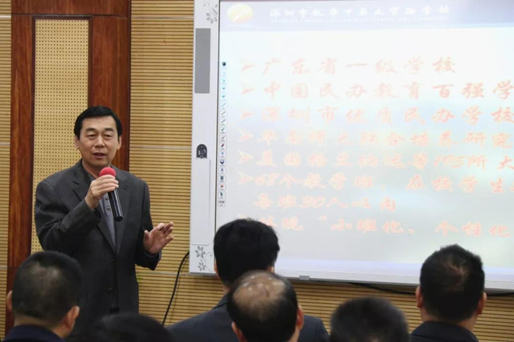 在學校教師培訓中心,全國名校長、特級教師、龍華中英文實驗學校卜祥林校長以《辦優質高端學校,育多元精英人才》為題,向領導嘉賓簡要介紹了學校的辦學成果。卜校長向來賓介紹了龍華中英文“2018年高考上線率達96.6%”,“2018春季全區質量調研檢測小學、初中、高中七個參考年級總均分有六個年級列全區民辦學校第一名;其中八年級列全區公民辦學校第二名”,學校“國際理解教育、藝體教育、創客教育”等特色或成果,學校“優化四大結構,深化五項改革”舉措等,表示龍華中英文實驗學校正以集團“美好教育”引領,以全面提高教育教學質量為核心,在龍華區乃至深圳市,都有著強大的核心競爭力和品牌影響力。