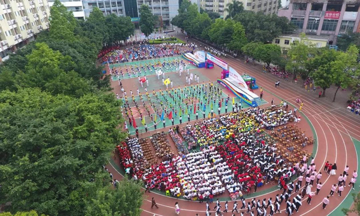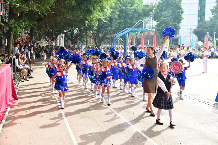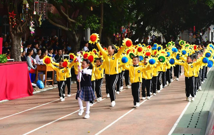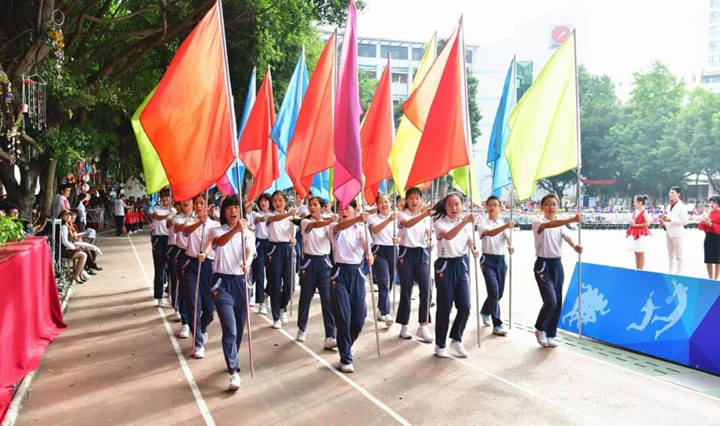 首先進行的是隊列式表演,小學、初中、高中等70多個方陣魚貫入場,一時運動場上形成了一道由色彩鮮艷的服裝和絢麗多彩的道具組成的靚麗風景,學生們步伐矯健,口號嘹亮,精神抖擻,走出了士氣,走出了自信,贏得了家長和來賓的陣陣掌聲。