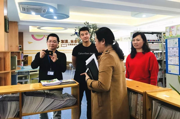 檢查組鄭旭彬、王怡峰兩位老師在學(xué)校金玉善副校長(zhǎng)以及學(xué)校部門負(fù)責(zé)人的帶領(lǐng)下,重點(diǎn)查看了我校英語(yǔ)交流中心、學(xué)習(xí)資源中心、國(guó)際班課室、長(zhǎng)廊文化展示、開放式英語(yǔ)小劇場(chǎng)等區(qū)域,對(duì)學(xué)校教育國(guó)際化特色的建設(shè)情況進(jìn)行了現(xiàn)場(chǎng)檢查。