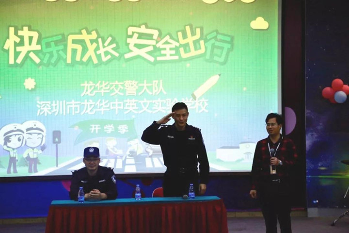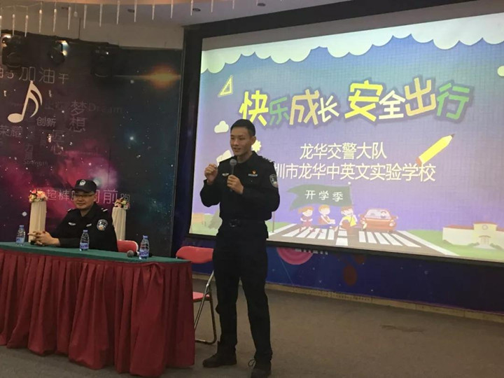 龍華交警大隊(duì)副大隊(duì)長(zhǎng)幸向兵同志向同學(xué)們介紹交通知識(shí)