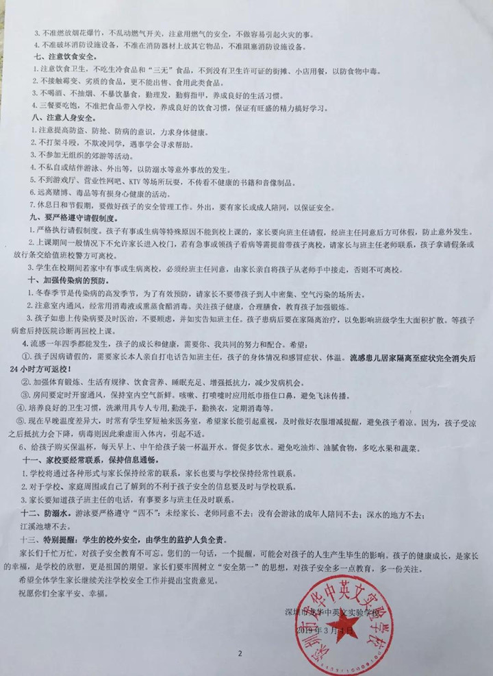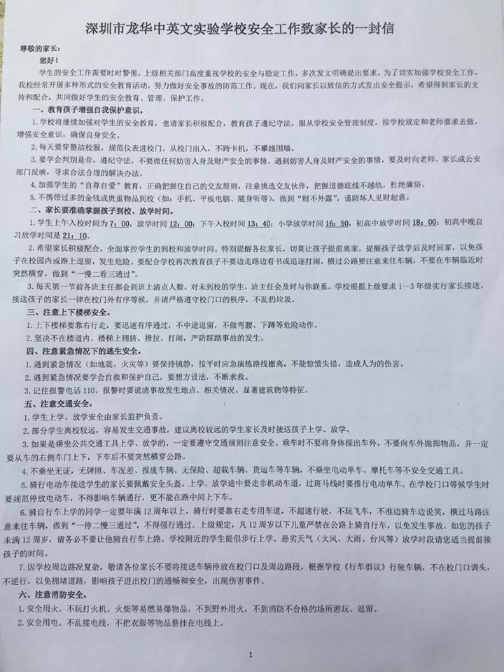 本學(xué)期開(kāi)學(xué)三周來(lái),學(xué)校開(kāi)展了多項(xiàng)安全教育活動(dòng),一是通過(guò)開(kāi)學(xué)前的安全隱患大排查大整治確保師生開(kāi)學(xué)安全。二是通過(guò)《安全教育第一課》主題班隊(duì)會(huì)課進(jìn)行安全知識(shí)講座。三是組織全校師生收看深圳市教育局和深圳市公安局組織的《交通安全第一課》。四是通過(guò)發(fā)放《安全教育工作致家長(zhǎng)一封信》提醒家長(zhǎng)關(guān)注安全工作。