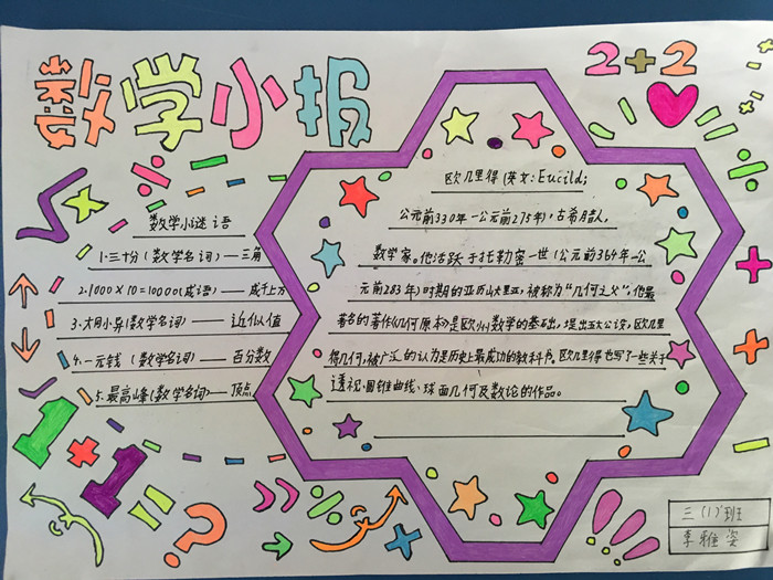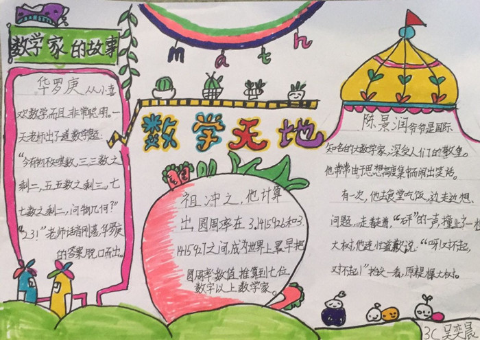 三年級(jí):數(shù)學(xué)手抄報(bào),通過了一張張精美的手抄報(bào)制作,讓我們走進(jìn)了數(shù)學(xué)家的故事,領(lǐng)略了數(shù)學(xué)名人的風(fēng)采,讓我們見識(shí)了數(shù)學(xué)名題、數(shù)學(xué)趣題,開拓了數(shù)學(xué)思維,讓我們了解了數(shù)學(xué)日記,打開了數(shù)學(xué)知識(shí)的大門。