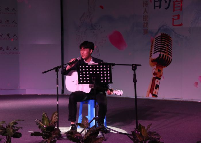 14號王超慧同學用一把吉自彈自唱一曲《成都》,觀眾的思緒隨著優美的歌聲徜徉在成都街頭,眼前仿佛出現了一家極具鄉情鄉韻的小酒館。