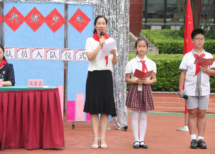 少先隊大隊輔導員馬定云老師在儀式中發(fā)表了講話。她在向新隊員表示祝賀的同時,激勵新老隊員用實際行動“踐行核心價值觀,爭做時代好隊員”。整齊響亮的“時刻準備著”的呼號表達了隊員們?yōu)榧t領巾增添光彩的決心、信心和恒心。