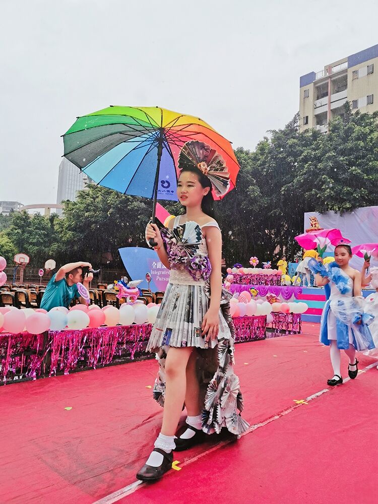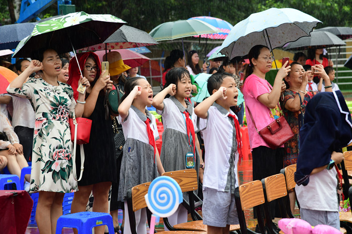 第三篇章,著力展現孩子們的進步和收獲。篇章節目涵蓋舞蹈、英語劇、科創、美術、經典歌曲傳唱等多種藝術形式。舞蹈《小白翎》精湛的表演讓觀眾目不暇接;《科創未來》融創客、美術、手工為一體,充分展現了孩子的動手能力和科創水平。最值得稱贊的是,當節目進行到尾聲時,天空竟下起了雨,表演《我們是共產主義接班人》的大隊委、中隊委們,在臺上面向隊旗、莊嚴宣誓、揮舞隊旗、齊唱隊歌,臺上臺下相呼應,風雨之中見精神,受到來賓和家長的高度贊揚。