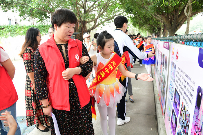 訓練有素的近60名一至六年級的小主持人,一對一拉著嘉賓和家長的手,參觀豐富多彩的學科作品,欣賞精巧精美的手工作品,品味富有特色的書法和布藝作品。小解說員良好的儀態、自信的解說、燦爛的笑臉成了作品展區一道靚麗的風景,來賓與家長贊嘆不已。