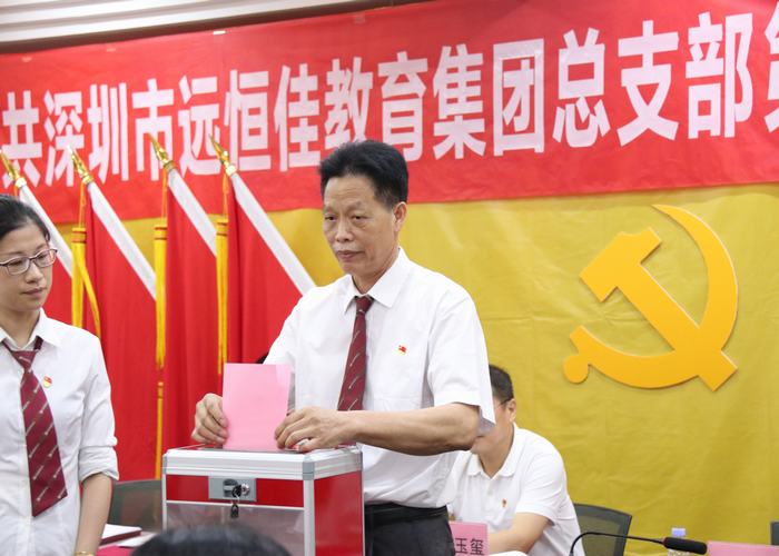 接著由現任集團黨總支部書記宋遠標同志代表黨總部支委員會作了題為《強化黨的政治核心引領,聚心聚力共謀優質發展》的報告。報告從“黨總支部的基本情況、六年來的主要工作回顧、取得的成績與不足、黨總支部對未來工作的建議”四大方面進行了全面總結。聽取完工作報告后,與會黨員認真審議并表決通過了宋遠標總支書記所作的報告。隨后按照會議議程分別舉手表決通過了《中共深圳市遠恒佳教育集團總支部選舉辦法》及監票人、計票人建議名單。在充分醞釀新一屆遠恒佳教育集團黨總支部委員會候選人預備人選的基礎上,以無記名投票、差額選舉的辦法選舉產生了由宋遠標、戴桓標、王開利、鄧木金、蔡文娜等5名同志為新一屆深圳市遠恒佳教育集團黨總支部委員會委員。最后,新一屆深圳市遠恒佳教育集團黨總支部委員會召開第一次會議,選舉產生了集團黨總支部書記宋遠標同志和集團黨總支部副書記戴桓標同志,同時對集團黨總支部委員的工作進行了分工,并將選舉結果上報到龍華區委教育工委審批。