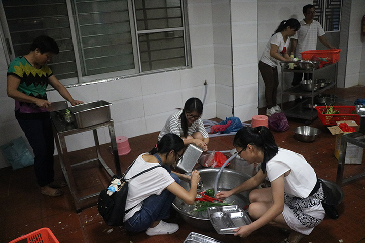 教師廚藝比賽是公明中英文學校建設幸福校園,活躍教職工業余生活的一項舉措。活動將全校教師分成六個組,每組給予一定的經費,食材自行購買,要求每組各出16個菜,其中4個菜參加評分,其余的菜參與交流。活動當天正好是運動會,老師們得以有時間到市場精選食材。下午5點鐘,運動會結束,學生全部離校后,老師們按照事先的分工有序的忙碌起來。洗菜、切菜、雕花、拼盤,平時溫文爾雅的老師現在儼然一個個大廚,鍋鏟飛舞、菜色琳瑯、滿室顠香,各組選派的廚師們輪番上陣,一人一個自己的拿手好菜,“我心飛翔”、“青龍臥雪”,不但看得人垂涎欲滴,連名字都起得這么有意境。在另一個賽場,進行的是”刀工、嗑西瓜子、喝啤酒和蒙眼喂甜筒比賽,比賽規定,四個項目積分最后的一個組,全組組員要喝苦瓜汁。為了不讓自己的組員出丑,場上隊員盡力表現,場下組員吶喊助威,滿臉的奶酪、對瓶吹啤酒的表情,嗨翻了全場。