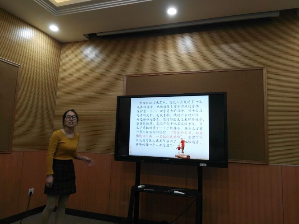 第二個環(huán)節(jié)是評課,上周胡靜老師上了一節(jié)公開課,胡老師首先講了一下自己的思路,然后余、陳兩位老師就存在的問題進行了點評,最后由徐老師對兩位老師的評課進行一個小結(jié)。
