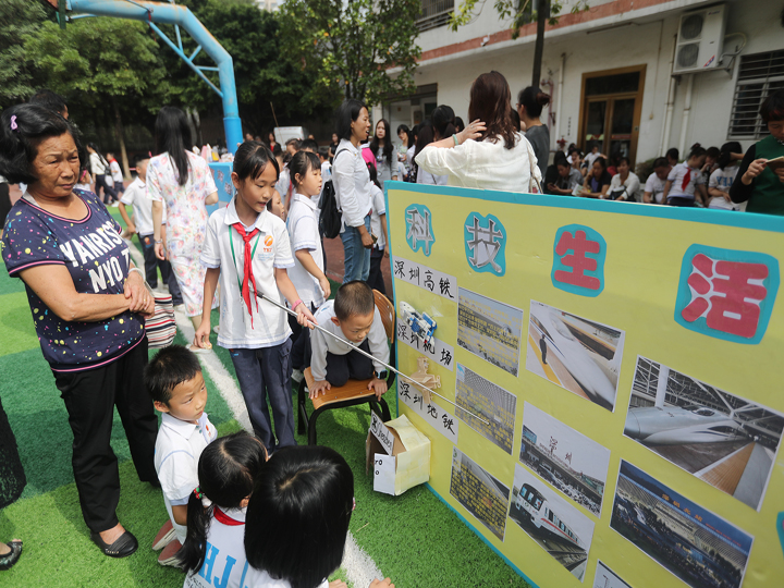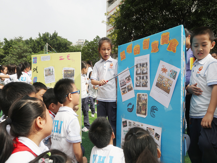 作為一所民辦學校,公明中英文學校的外來工子女占到90%之多,為讓孩子們盡快適應、喜歡、融入這座城市,本學期該校選擇了“多彩深圳”這一主題做為主題方案學習內容。主題確定后,各年級圍繞該主題再選擇子主題,比如一年級選擇景點、二年級選擇美食、三年級選擇交通、四年級選擇建筑等,然后各班再根據年級主題采用頭腦風暴確定展示的內容、方式和任務分工。朋友間交流、向家長請教,上網絡查詢,同學們通過各種方式收集、整理相關內容,并通過手抄報、繪本的形式制做主題展板。活動當天,當各班的展板呈現在師生家長面前時,整個展區匯成了一個五彩斑瀾的知識海洋。“這是深圳的知名企業,騰訊、華為……”,“地王大廈正式名為信興廣場……,創造了世界超高層建筑最“扁”最“瘦”的世界紀錄”,孩子們在展位前如數家珍,向師生家長介紹深圳的各種特色,吸引了大批的參觀者駐足了解。三D班制做的深圳機場模型,維妙維肖,做工精致,不少家長拿出手機拍照留念。而四年級設制的有獎問答,只要答對問題,便能得到一份現場制做的美食,吸引同學們排起了兩條長龍。(文、程俊)