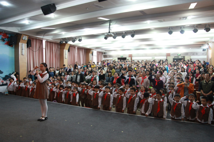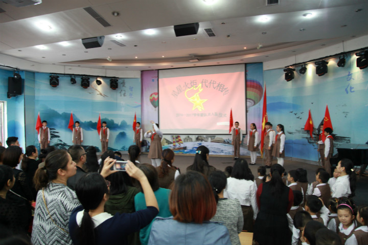 首先,少先隊大隊輔導員張丹老師宣讀了新隊員名單,然后新隊員們走上舞臺進行儀式,當老隊員們把鮮艷的紅領巾戴在新隊員胸前時,每一張可愛的小臉上都洋溢出純真而自豪的微笑。隨后,新隊員在大隊長陳思穎的帶領下莊嚴宣誓——“我是中國少年先鋒隊隊員,我在隊旗下莊嚴宣誓:我熱愛中國共產黨,熱愛祖國,熱愛人民,好好學習,好好鍛煉,準備著:為共產主義事業貢獻力量!”——鄭重、宏亮、整齊的聲音響徹了整個校園!