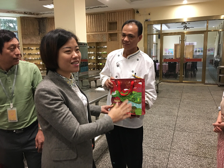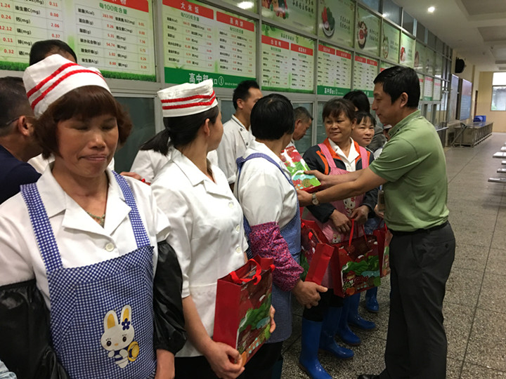 2017年3月31日下午,后勤服務公司食品采購部李莉萍總經理親臨我校對食堂員工進行表彰,并同鄧木金總經理,龍華中英文實驗學校王開利副校長給食堂員工頒發了獎品。