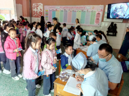 檢查過程中,學生在班主任的帶領下,在后勤劉冬偉主任和一二年級熊會容主任指揮領導下,以班級為單位有序的進行口腔檢查活動。醫護工作人員也非常仔細認真的對每一位學生進行口腔檢查和登記,并給學生發放了《免費窩溝封閉預防齲齒》宣傳單及《窩溝封閉,遠離齲齒—致家長的一封信》,為后續免費為適齡兒童做窩溝封閉奠定了良好的基礎。