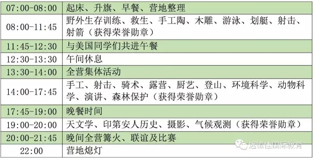 拓展新的社交圈、說一口流利口語、培養創造性思維、開闊眼界、提升領導才能、強健體魄、富有擔當精神、掌握野外生存技能……放松自在的全英文環境,充滿善意的外國玩伴,豐富多彩的教學課程,賞心悅目的藍天碧水,除了讓你搖身變成“美國通”,還能獲得珍貴的跨國“戰友情”!
