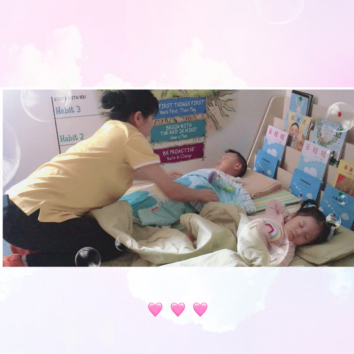 午睡時,會進行午檢,從體溫口腔五官身體,及時發現不舒服的寶寶;孩子入睡時,班級老師會進行巡視,并幫孩子蓋好被子,以防著涼。
