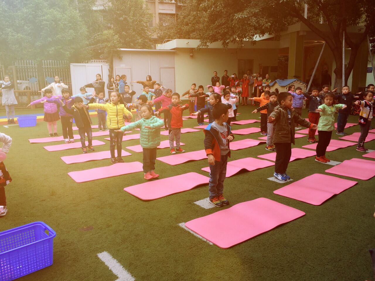 按照幼兒園安排,我們先觀摩大班組的早操活動。操場空間雖不算大,但老師們能利用有限空間,靈活開展不同特色的體能鍛煉活動。雖然道具簡單,但操節內容豐富多彩,在老師的引導下,孩子們伴隨著音樂的節奏,快樂地變化著不同的肢體動作,令我們目不暇接,收獲頗豐。
