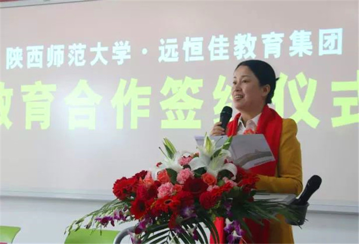 遠恒佳教育集團總校長、教育研究院院長畢國軍博士主持了簽字儀式,陜西師范大學畢業生就業指導服務中心雒朝梁主任宣讀教育合作協議書,遠恒佳教育集團董事長助理程琳娜和陜西師范大學黨委副書記盧勝利簽訂了合作協議書。