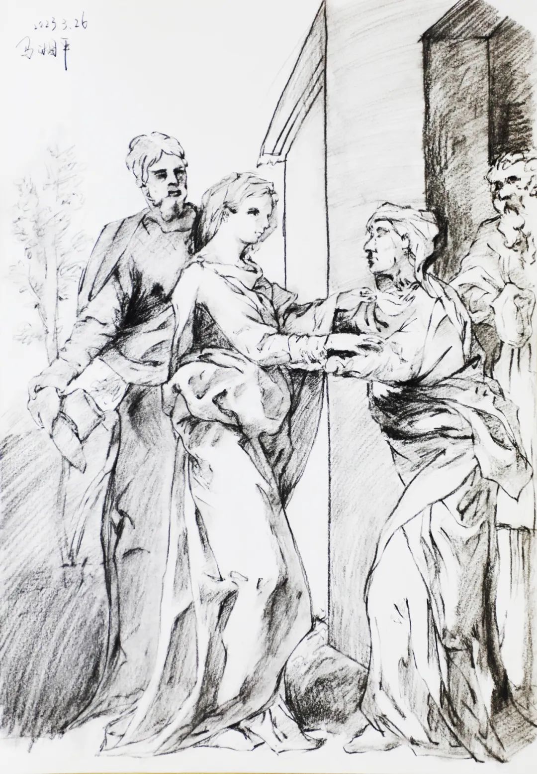 速寫是一種相對快速的素描形式。所選學生速寫作品畫面干凈,構圖舒適,線條流暢度高,疏密、粗細、虛實變化表現好,體積感強,人物造型動態比例準確,畫面節奏感、黑白灰處理明確,速寫味濃。